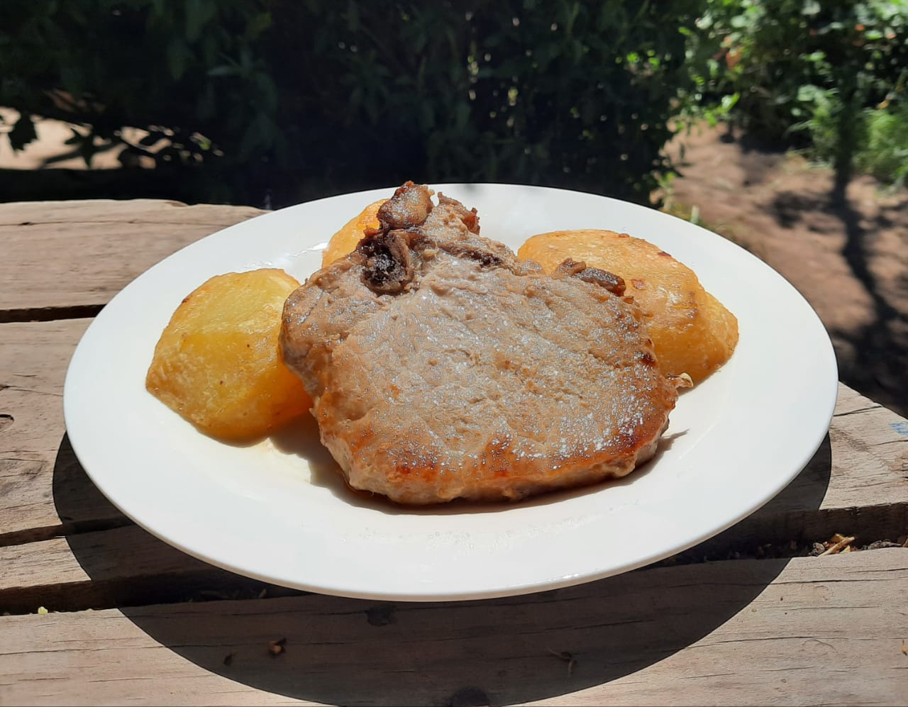 Chuleta de centro al sartén, con agregado de arroz o papas doradas o puré, según disponibilidad, más ensalada surtida y postre chico
